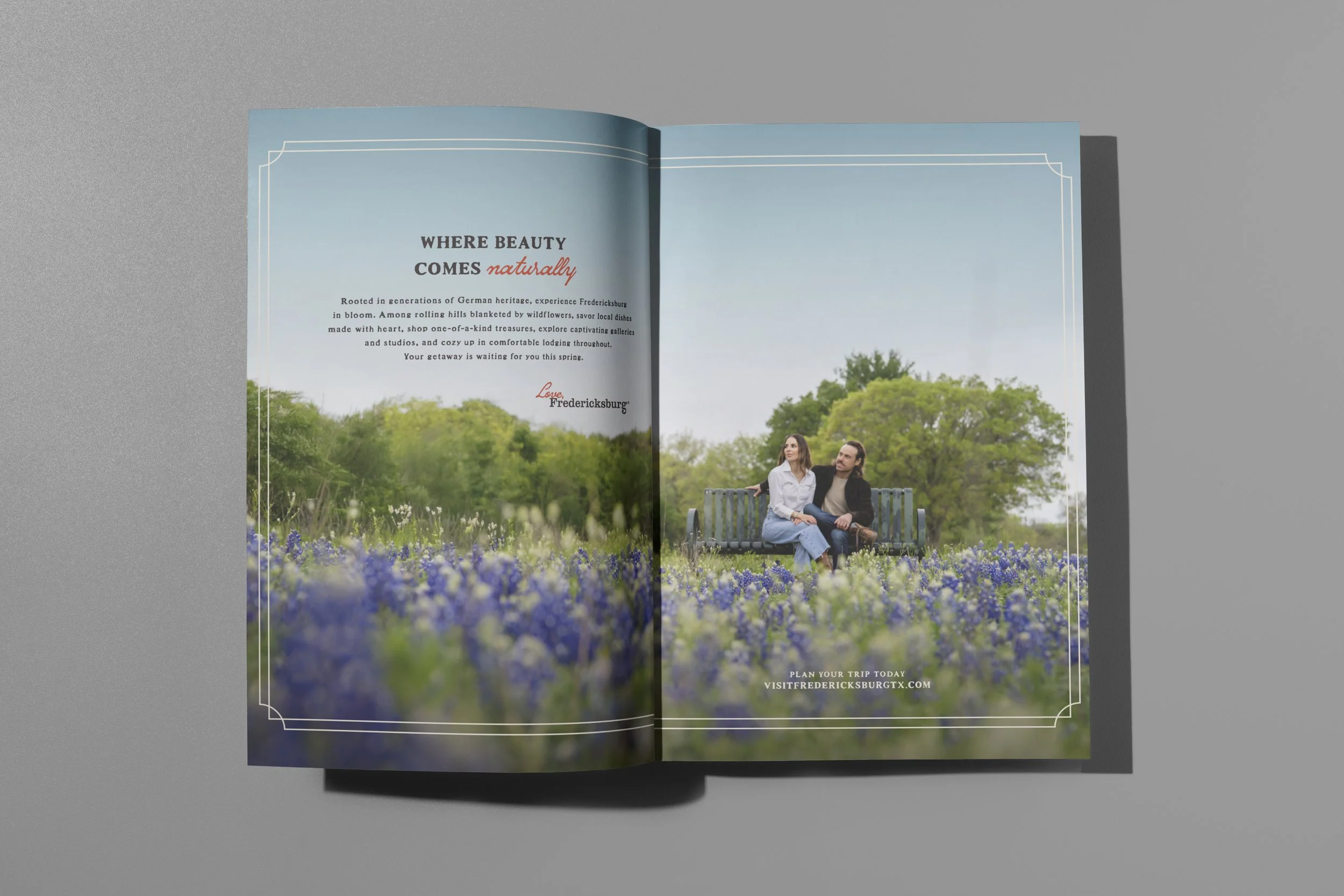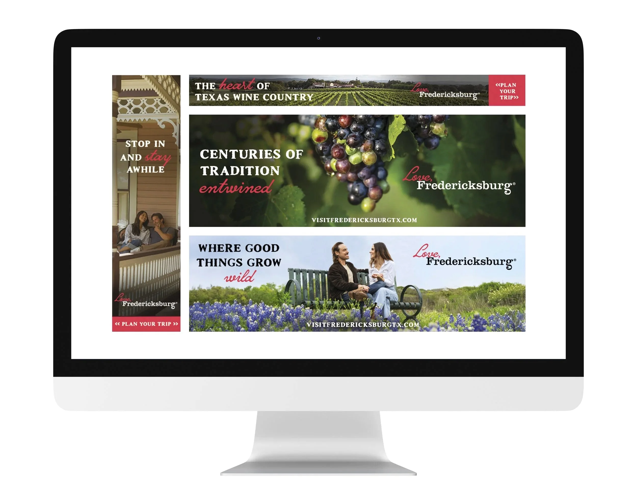 From campaign concept execution to countless productions, the Love, Fredericksburg campaign assets crossed platforms including CTV, Texas Monthly, Garden & Gun, Texas Highways, digital and OOH billboards, web banners, FCVB’s website and print collateral.